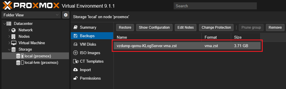 - Proxmox arayüzünde Datacenter’ın altındaki Local seçeneğine tıkayınız ve Backups sekmesine gidiniz. Kopyaladığınız .vma.zst uzantılı yedek dosyasını listede görmelisiniz: