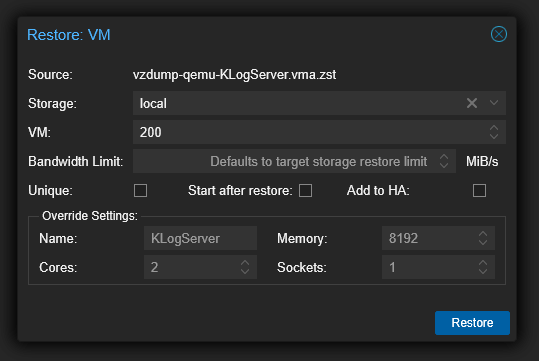 KLog Server .vma.zst uzantılı Proxmox yedek dosyasını indiriniz ve dosyanın bütünlüğünü doğrulayınız. Yedek dosyasını indirdikten sonra aşağıdaki adımlar izleyerek Proxmox VE platformuna kurulumu gerçekleştirebilirsiniz.